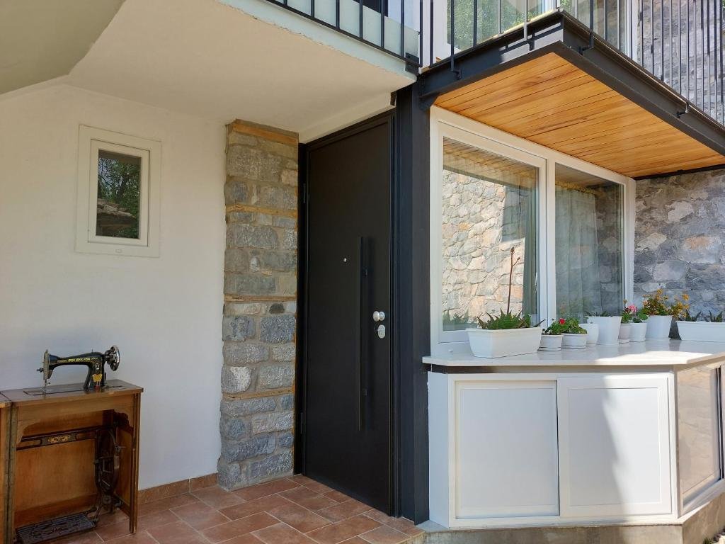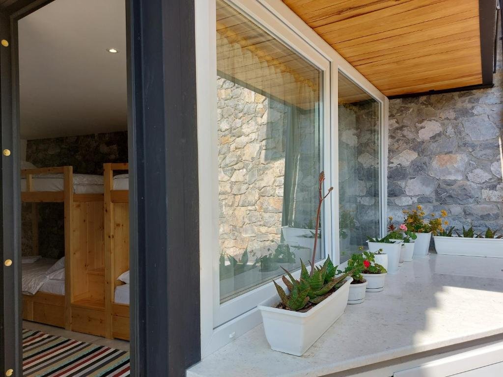 Perfect for families or groups, this room features four bunk beds with colorful traditional Albanian bedding, stone walls, and a private bathroom with shower. Cozy, spacious, and full of character.