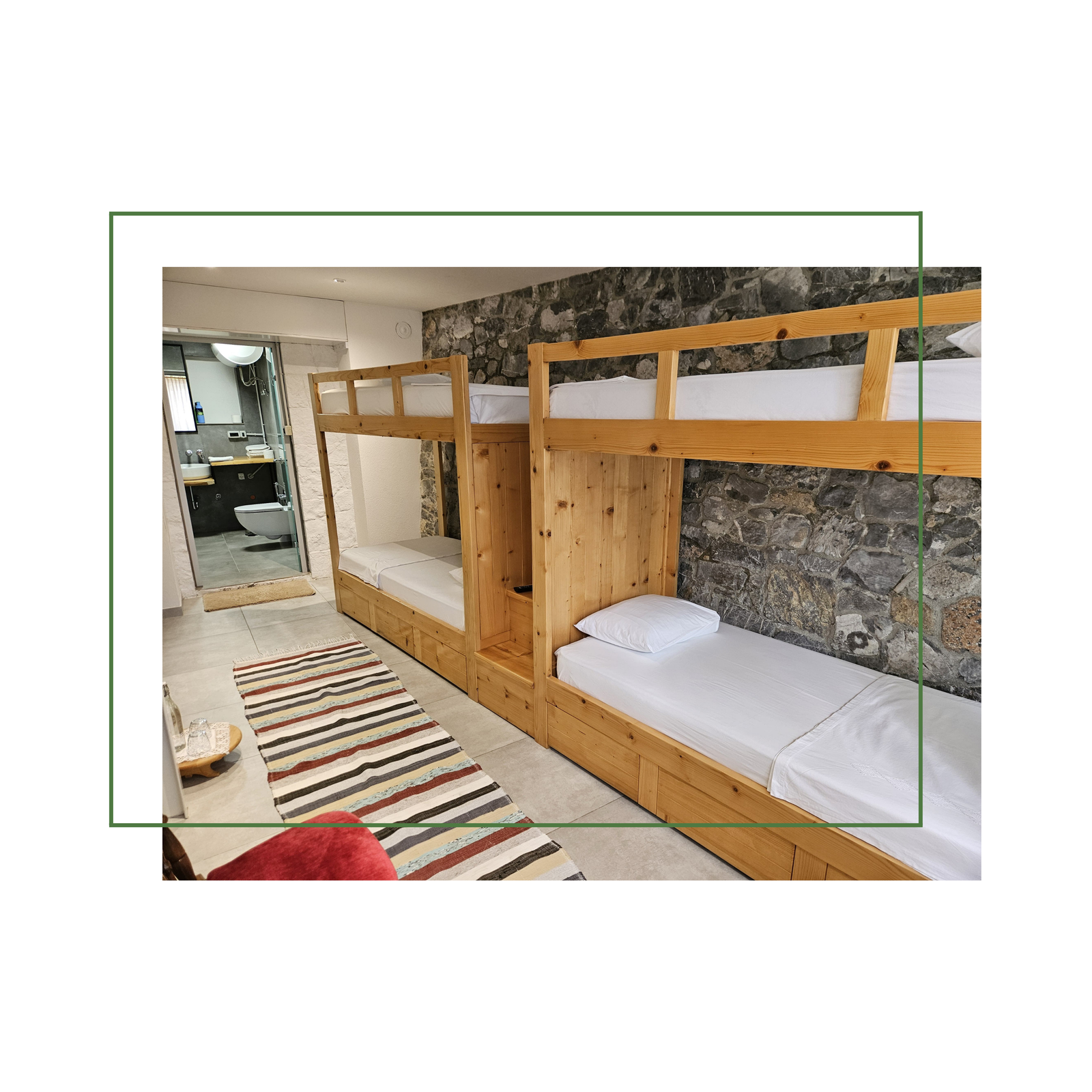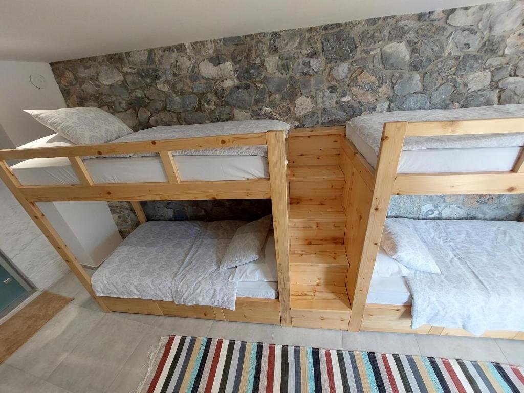 Perfect for families or groups, this room features four bunk beds with colorful traditional Albanian bedding, stone walls, and a private bathroom with shower. Cozy, spacious, and full of character.